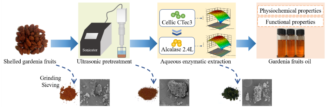 团队基于超声波技术建立了超声预处理结合分步水酶法提取栀子油的新方法,克服了栀子油提取技术受限、提取率低的问题。该成果以Ultrasound-assisted aqueous enzymatic extraction of gardenia fruits (Gardenia jasminoides Ellis) oil: Optimization and quality evaluation为题,在Industrial Crops & Products上发表,王丹丽博士为第一作者。