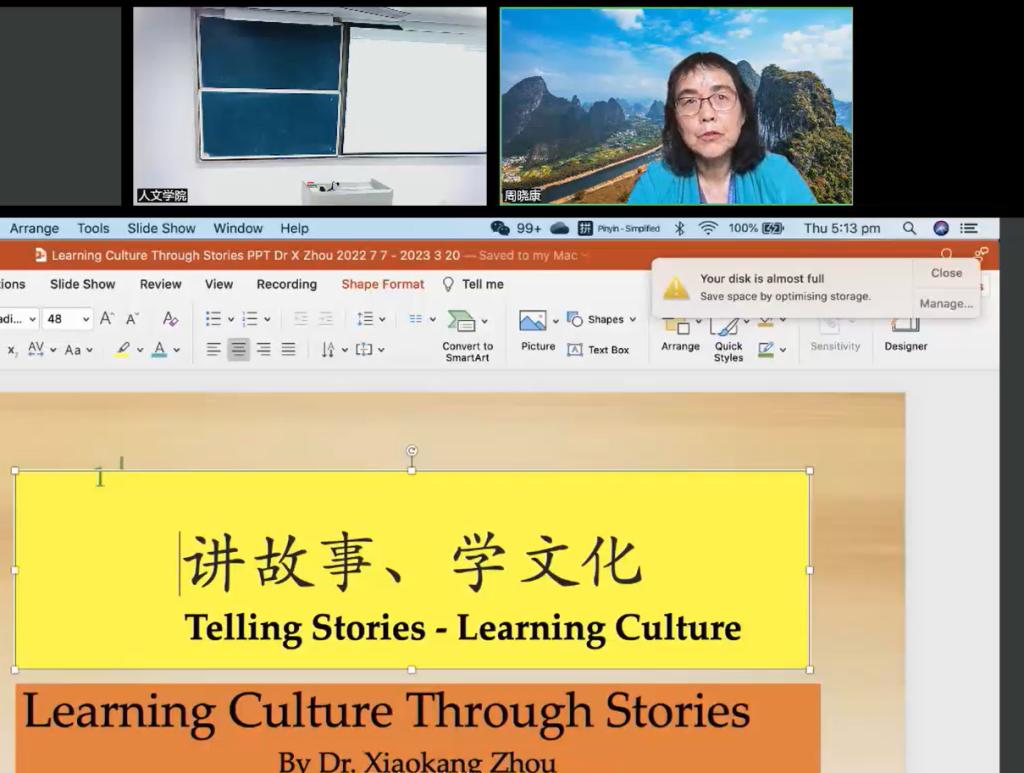 3月30日,人文学院特邀澳大利亚墨尔本Peninsula Gramma学校中文系主任周晓康博士开展以“讲故事、学文化”为主题的讲座。本次讲座以线上和线下相结合的方式举行,人文学院的部分教师及汉语国际教育专业22级研究生聆听讲座。