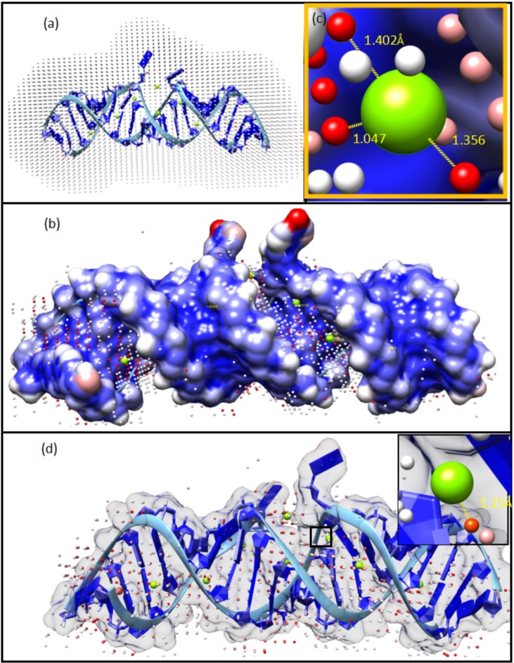 (图2 (a) 462D全空间枚举decoy Mg2+; (b) 462D分子表面预测效果图,绿球为真实Mg2+,红球为预测TOP-1可信Mg2+,白球为不可信Mg2+;(c) 局部放大图;(d) 462D分子骨架效果图)