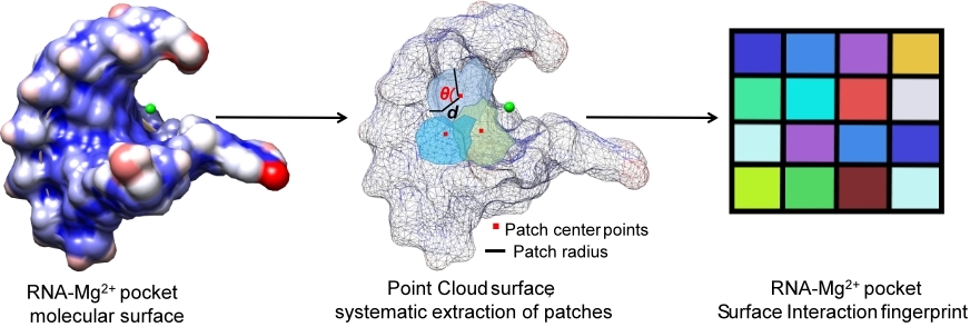(图1 左:RNA-Mg2+结合口袋;中:RNA-Mg2+口袋点云数据表面;右:分子表面相互作用指纹)