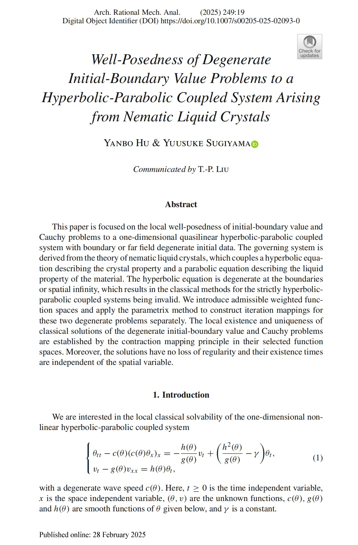 近日,非线性偏微分方程团队胡燕波教授与日本滋贺县立大学Yuusuke Sugiyama教授合作,在《Archive for Rational Mechanics and Analysis》(理性力学与分析档案,简称ARMA)上发表长达66页的论文。这篇题为“Well-Posedness of degenerate initial-boundary value problems to a hyperbolic-parabolic coupled system arising from nematic liquid crystals”(点击阅读)的研究论文,理学院胡燕波教授为第一作者,开元集团网站为第一完成单位。