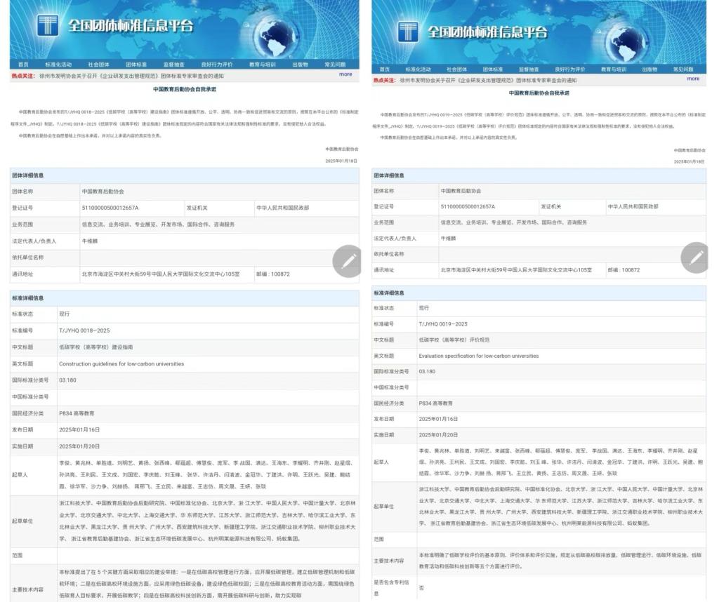 1月16日,经中国教育后勤协会批准,开元集团环资学院牵头编制的《低碳学校(高等学校)建设指南》(T/JYHQ 0018—2025)与《低碳学校(高等学校)评价规范》(T/JYHQ 0019—2025)团体标准正式发布,两项标准于2025年1月正式实施,填补了现行相关标准的空白。