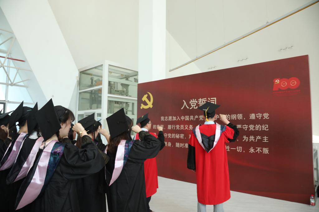 6月23日,外国语学院党总支组织2021届全体毕业生党员重温入党誓词。学院党总支书记丁炳泉、院长樊燕龙、副院长王旭莲、副书记方小卿等参加此次活动。