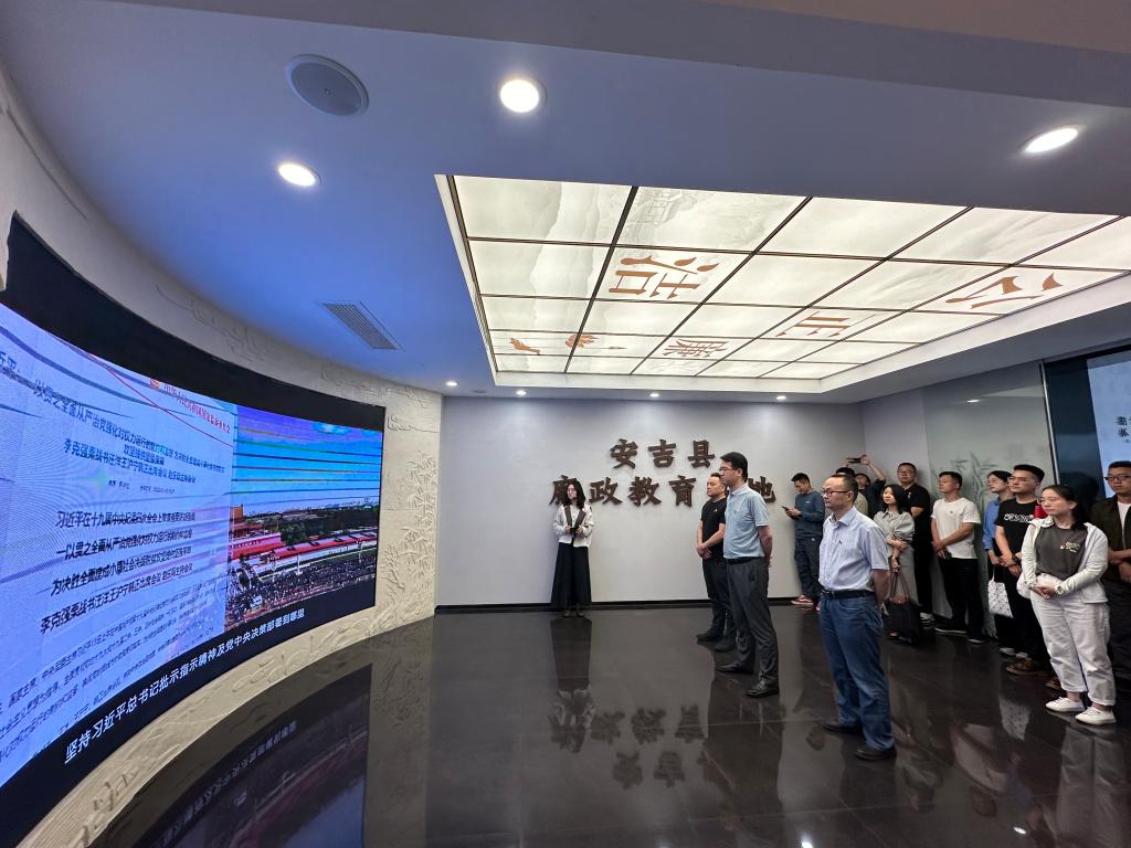 安吉县廉政教育基地由“管党治党 全面从严”“典案问廉 警钟长鸣”“竹青茶白 风清气正”三个篇章内容组成。在讲解员的引导下,全体人员观看了《绿水青山清风来》廉洁宣传片,沉浸式地学习了党的十八大以来党中央关于党风廉政建设和反腐败斗争的决策部署,听取近年来30余起违纪违法典型案例介绍,上了一堂深刻的党纪教育课。