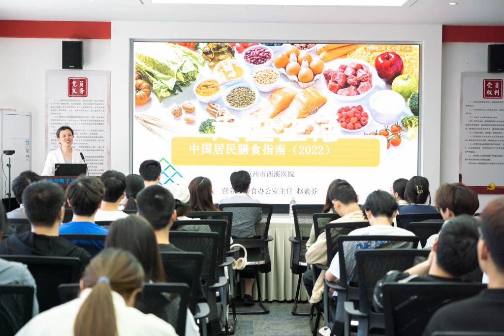 本次讲座由杭州市西溪医院营养与膳食办公室主任赵素芬主讲,为师生带来一场精彩的营养周科普讲座。结合今年全民营养周主题“奶豆添营养,少油更健康”,她围绕膳食模式、健康烹饪食材、吃动平衡健康体重等方面进行详细讲解。她指出,大学生在日常饮食中多吃蔬果、奶类、全谷、大豆,重“鲜”,选“色”,多“品”,形成良好运动习惯,增强身体素质,提升健康水平,共同践行“健康中国 营养先行”理念。