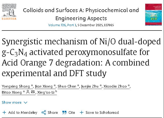 近日,应用物理2022级本科生商永兴以第一作者身份在《Colloids and Surfaces A: Physicochemical and Engineering Aspects》期刊上发表了题为“Synergistic mechanism of Ni/O dual-doped g-C3N4 activated peroxymonosulfate for Acid Orange 7 degradation: A combined experimental and DFT study”(阅读原文)的文章。开元集团网站为第一署名单位,应用物理系熊必涛老师为论文通讯作者。