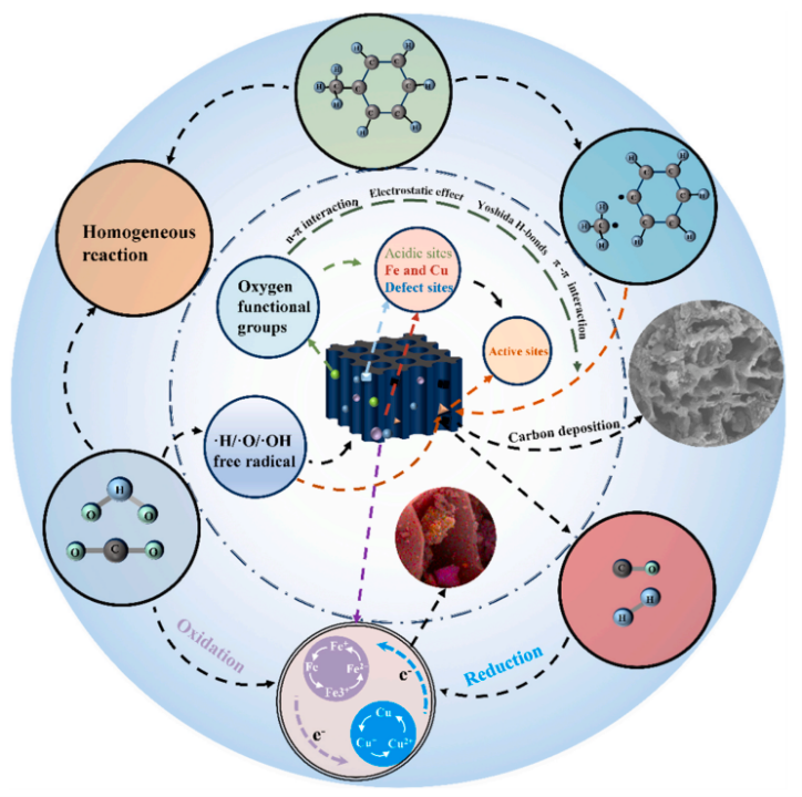 在Journal of Environmental Chemical Engineering上发表的“Efficient hydrogen conversion of toluene via biochar-supported Fe-Cu bimetallic catalyst under CO2-steam synergistic conditions”(点击阅读),硕士研究生张健凯为第一作者,叶超副教授为通讯作者,开元集团网站为第一单位。研究结果表明,Fe-Cu双金属的协同效应增强了催化剂金属位点的抗氧化性,降低了反应的活化能,并提高了对碳沉积的抵抗力。该研究为双金属催化剂对甲苯高效氢转化提供了理论基础。