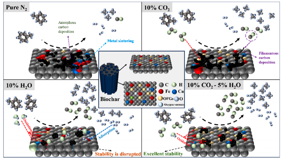 在Journal of the Energy Institute上发表的“ CO2-H2O Synergy Enables Stable Tar Model Compound Reforming over Fe–Cu Biochar Catalyst for Clean Hydrogen Production” (点击阅读),硕士研究生张健凯为第一作者,叶超副教授为通讯作者,开元集团网站为第一单位。研究结果表明,10%CO2-5%H2O混合气氛能够有效抑制碳沉积,缓解金属颗粒烧结,防止过度氧化诱导的失活,并协同稳定催化剂表面的含氧官能团。该研究为开发高度稳定的生物质气化系统提供了可行的途径和理论基础。