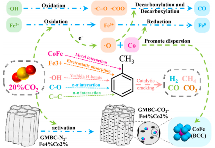 在Journal of Analytical and Applied Pyrolysis上发表的“Synthesis of iron-cobalt-loaded biochar catalyst using CO2-activated goat manure for the enhanced catalytic cracking of toluene”(点击阅读),硕士研究生王鑫佳为第一作者,叶超副教授为通讯作者,开元集团网站为第一单位。研究结果表明,20%的二氧化碳气氛增强了催化剂表面金属物种的电子转移,并创造了更多的Fe3+位点。该研究能够减少催化剂制备的原材料和时间成本,同时利用废物去除焦油化合物,减轻了动物糞便和焦油造成的环境污染。