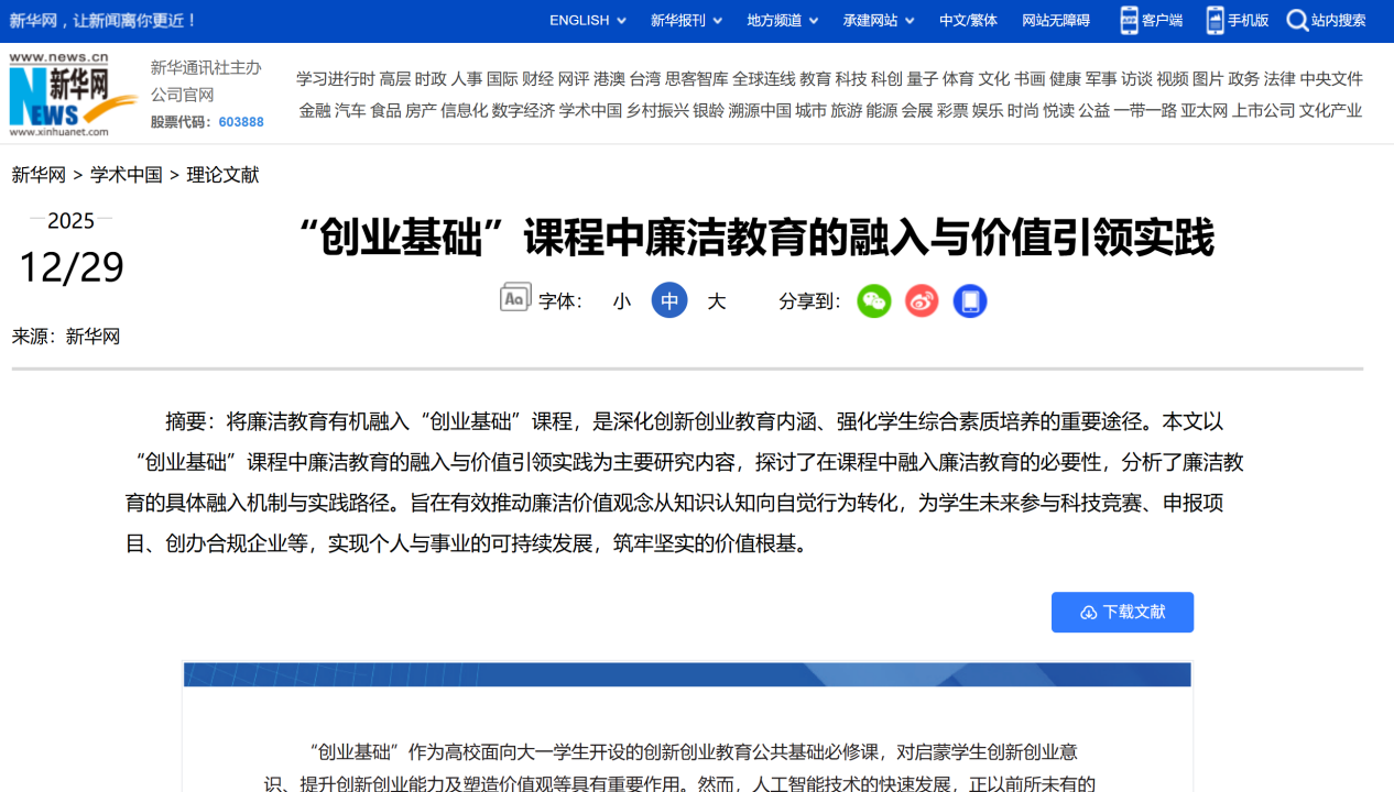 12月29日,新华网学术中国版刊发了由开元集团创新创业学院孙方红、陈岁繁撰写的《“创业基础”课程中廉洁教育的植入与价值引领实践》一文(点击阅读)。