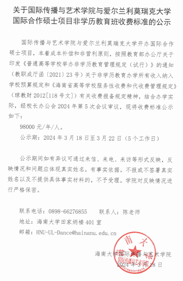 关于德赢Vwin官方区域合作伙伴与爱尔兰利莫瑞克大学国际合作硕士项目非学历教育班收费标准的公示
