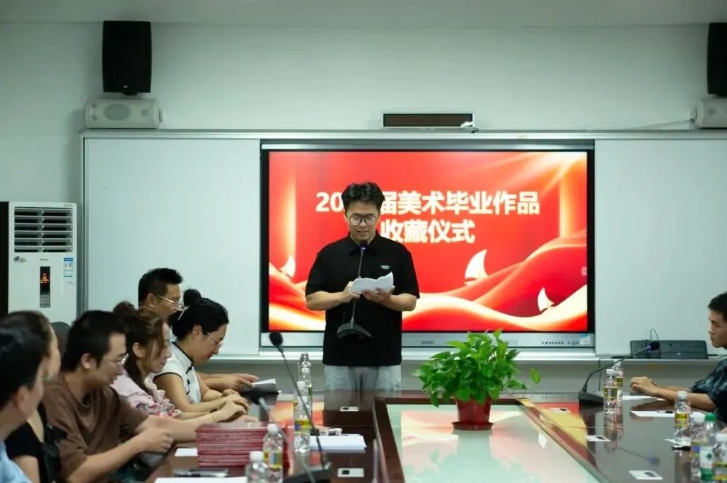 仪式上,郑立波院长对毕业生的艺术才华和努力表示高度赞赏,强调学院对美术教育的重视和对学生创作成果的认可。他对2024届毕业生的美好未来提出了殷切希望,并分享自己大学故事和生活感悟。他说,作品被学院收藏是一种荣耀,更是连接母校的情感纽带,为自己的一生种下美好记忆的种子。他希望同学们记住这个时刻,以此为起点在艺术之路上不要试图走小路、近路,而是要走大道,以开放包容的心态对待艺术和人生。参加收藏仪式的同学代表表达了自己对学校、学院和老师的感激之情,表示自己的作品能被学院收藏感到非常荣耀,对自身是很大的激励,感恩老师们的培养和指导。