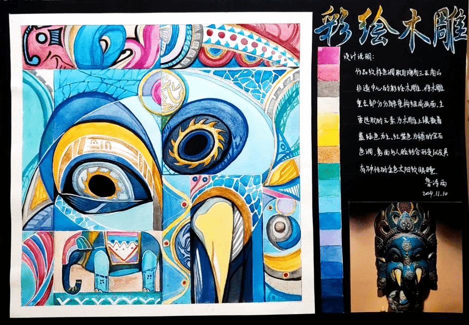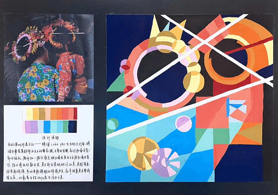 展厅内,海南地域特色主题作品成为焦点。大一学生以热带水果形态解构的作品,展现了学生观察能力与抽象思维的萌芽;黎族纹样与海洋文化主题的作品,融入了丰富的现代视觉语言;南海沉船文物的色彩采集与重构作品,则通过历史遗存激发了色彩叙事实验。