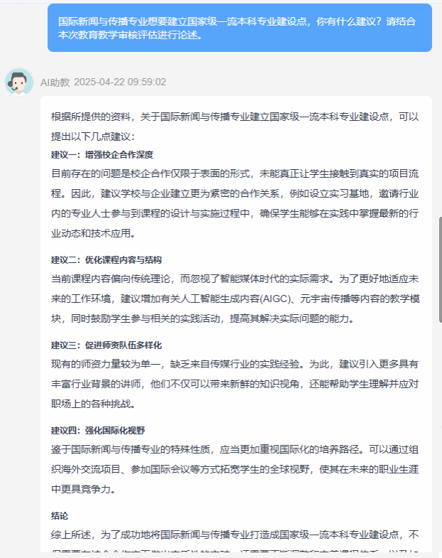 多名教师表示,AI问答栏目帮助其更清晰地把握评估要求,从而优化课程设计;学生则通过平台深入了解了学院发展动态,增强了专业认同感。下一步,学院将结合反馈意见,持续完善栏目内容,并开展线下评估知识竞赛、教学成果展等系列活动,在学院内营造“人人关心评估、全员助力发展”的良好氛围。