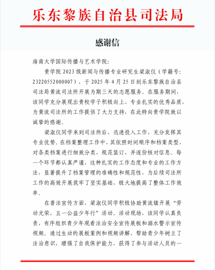 来信中写道,自2025年4月25日开始,梁淑仪同学于黄流司法所开展了为期三天的志愿服务,期间充分发挥专业优势,在档案管理工作中,系统规范建档流程,科学优化分类编码体系,规范了档案管理基础工作,并创新开展基层普法宣传活动,通过案例分析与情景互动相结合的模式,切实提升青少年法治观念与安全防护意识,其务实严谨的工作作风与扎实的专业能力,为基层法治建设注入了新生力量。