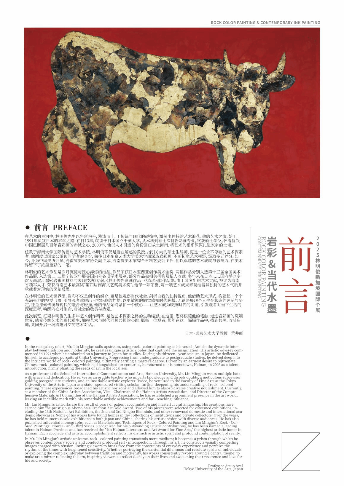 2025年6月1日至8日,德赢官网美术系林明俊教授国际个展《岩彩丹青——岩彩&当代水墨》,将在新加坡若轩艺术展示空间开展。
