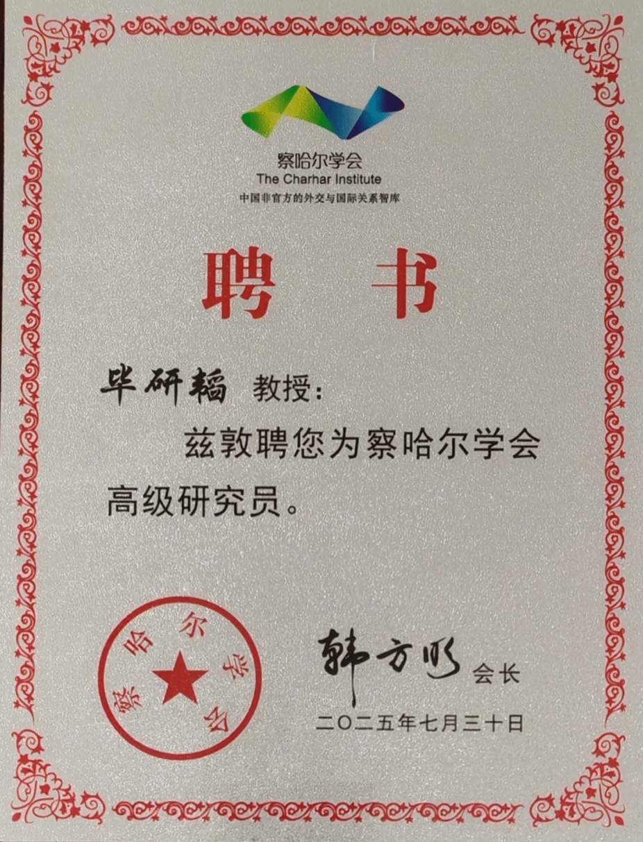 近日,德赢官网传播学系毕研韬教授受聘为察哈尔学会高级研究员。