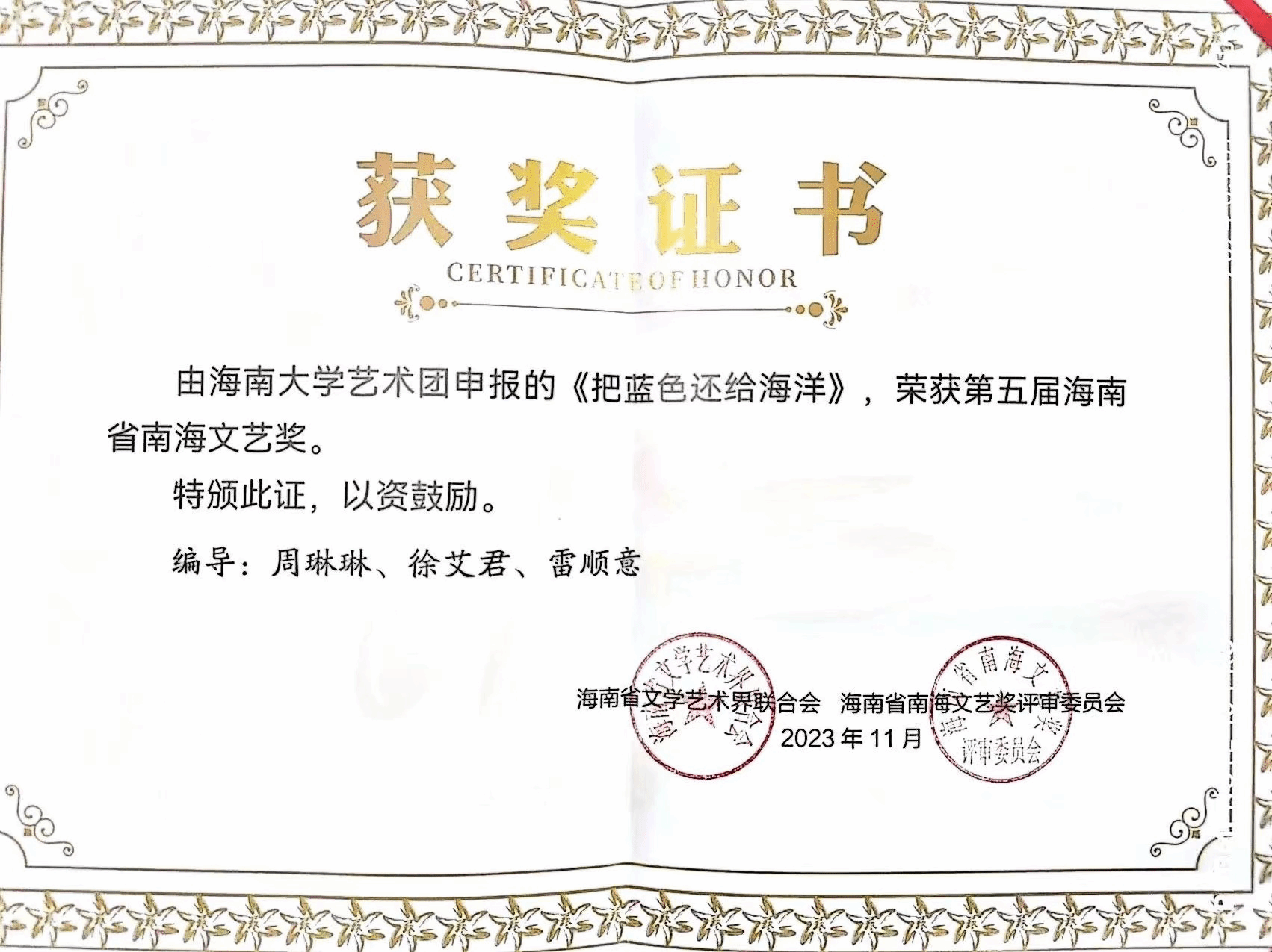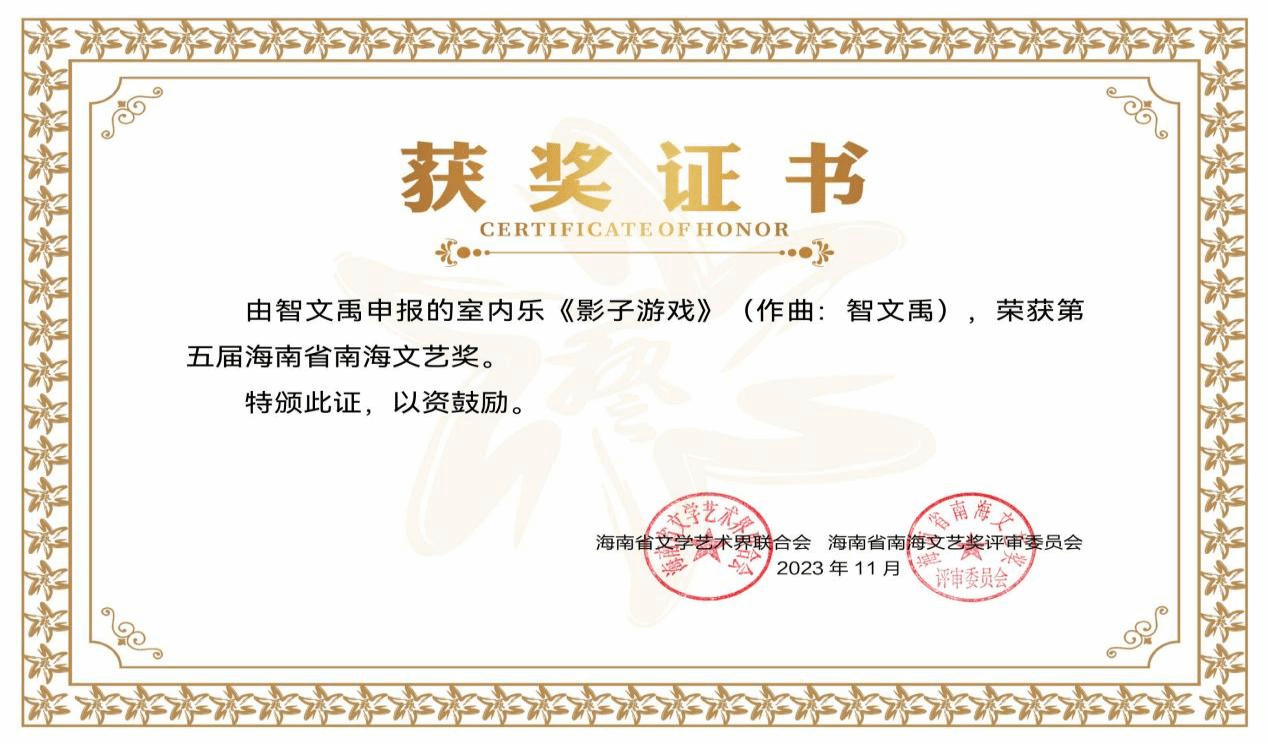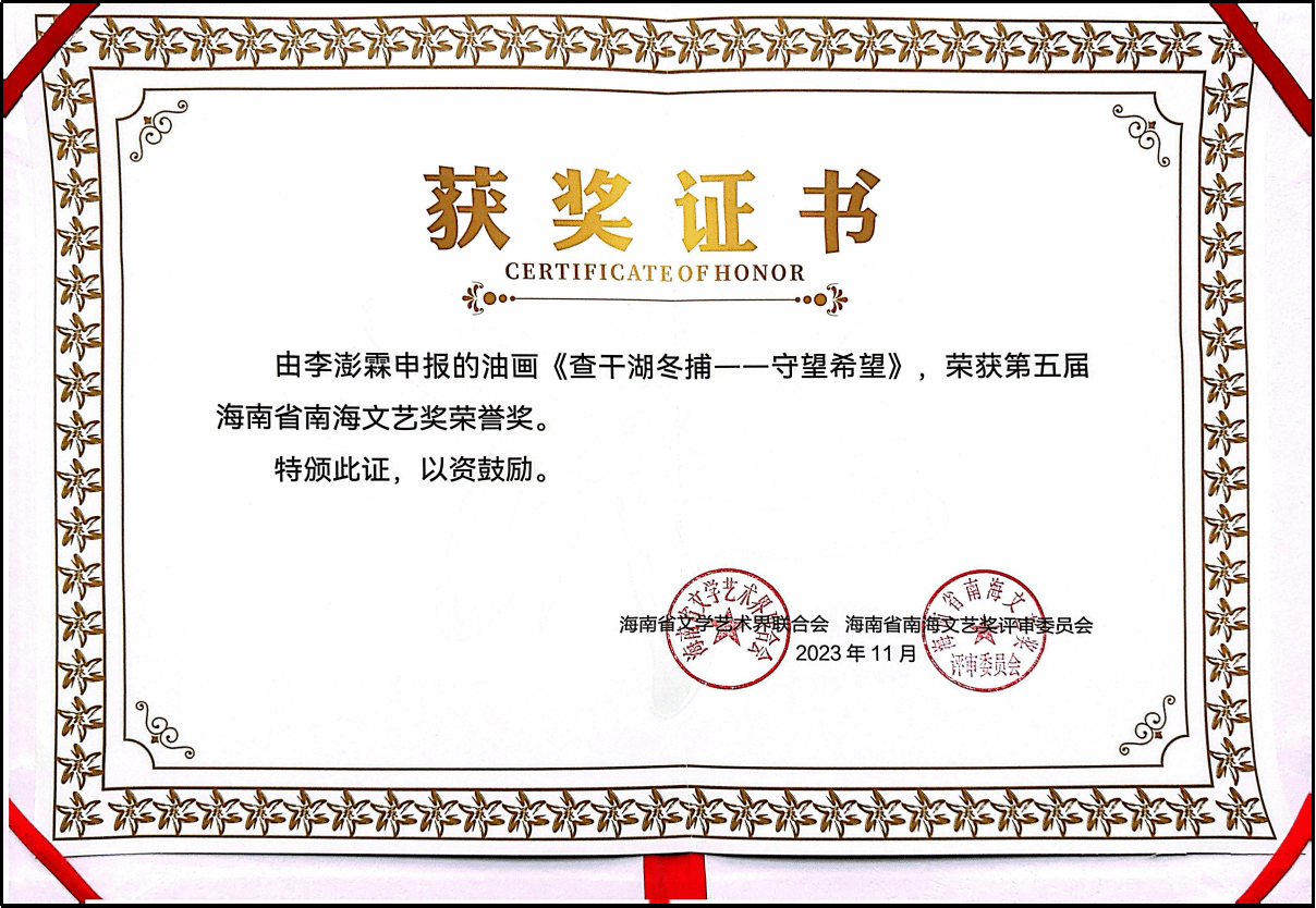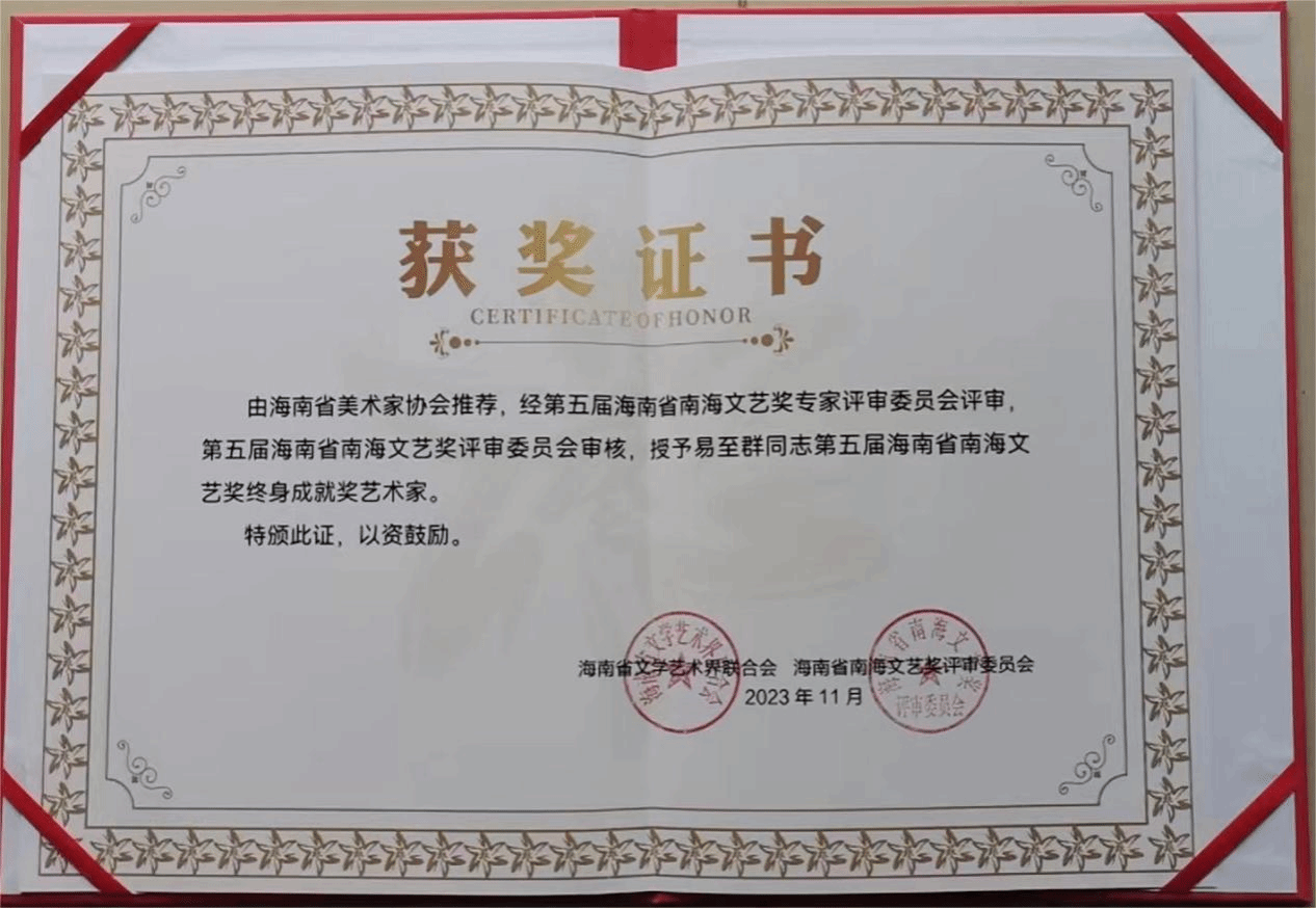 2024年2月28日,海南省文联七届二次全省委员会在海口召开,会议公布了“海南省第五届南海文艺奖”评审结果,并向海南省第五届南海文艺奖终身成就奖、荣誉奖及文学、戏剧、书法、美术、音乐、舞蹈等十二个艺术门类的获奖作品作者代表颁奖。