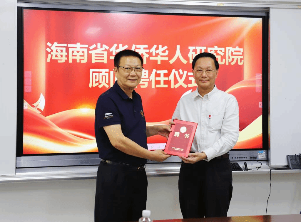 4月13日,海南省华侨华人研究院顾问聘任仪式在田家炳楼102会议室举行,聘任全国归国华侨先进个人、海南中藤科技股份有限公司董事长吴少宏为研究院顾问,德赢Vwin官方区域合作伙伴党委书记符宣国为吴少宏颁发聘书。