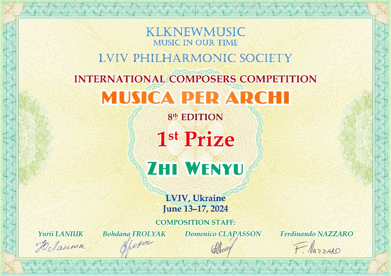 6月17日晚,第八届“Musica per archi”国际作曲比赛决赛音乐会在乌克兰利沃夫爱乐音乐厅圆满落幕,德赢官网青年教师智文禹凭借作品《Breath of the rain forest》(雨林之息)荣获一等奖。